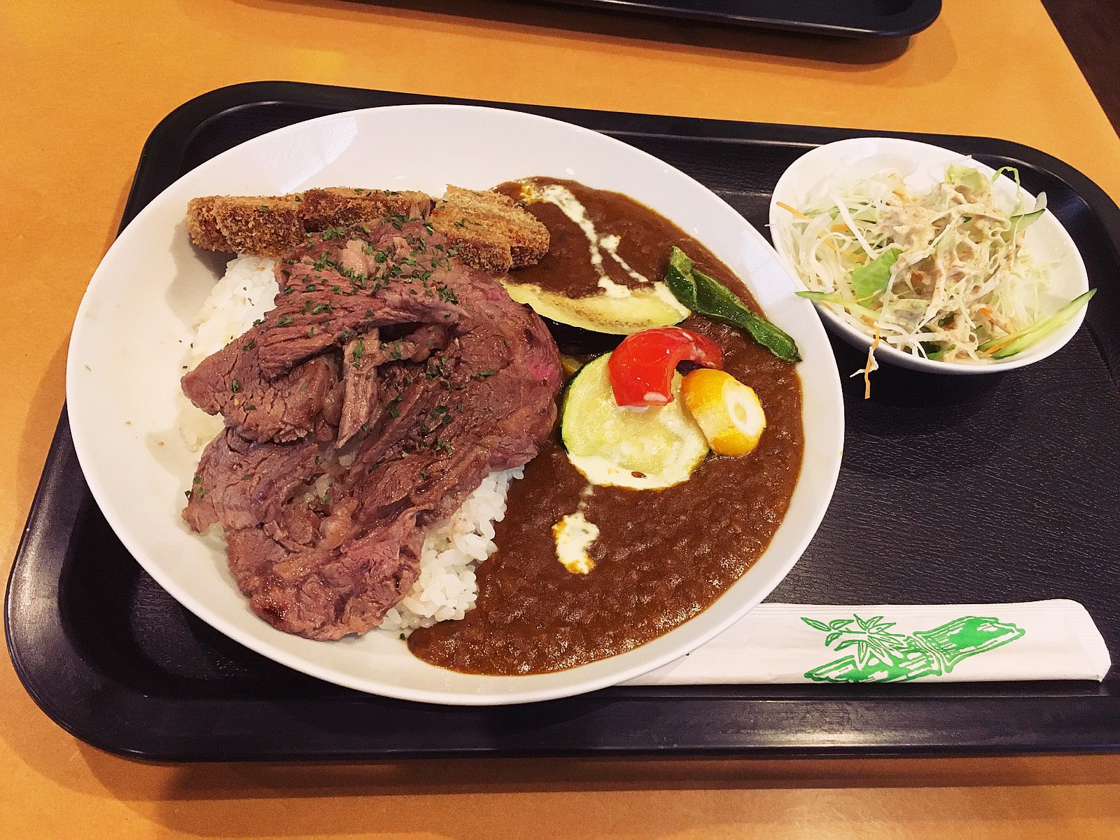 今日はライスカレーを注文したらカツとステーキが付いてきたというおもてなし